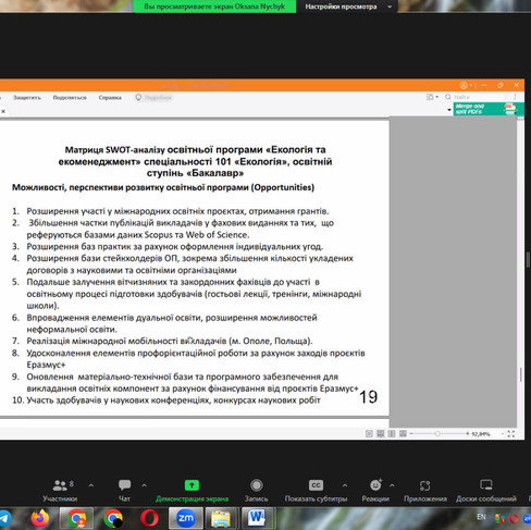 Із докладним аналізом ОПП виступила Гарант доц. Ничик О.В. Гарант підкреслила унікальність (особливість) ОП, відповідність цілей ОП місії та стратегії ЗВО, відповідність загальних, фахових компетентностей та програмних результатів вимогам стандарту вищої освіти за спеціальністю 101 «Екологія».